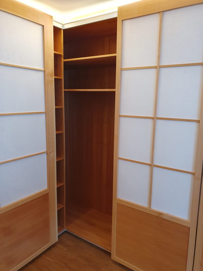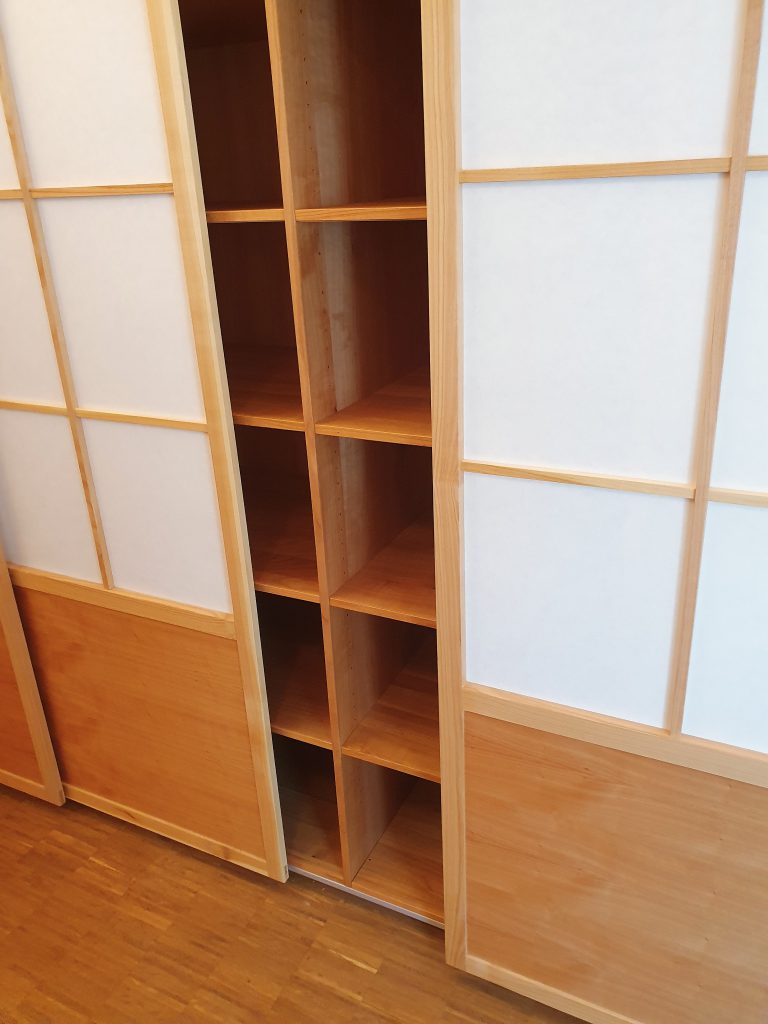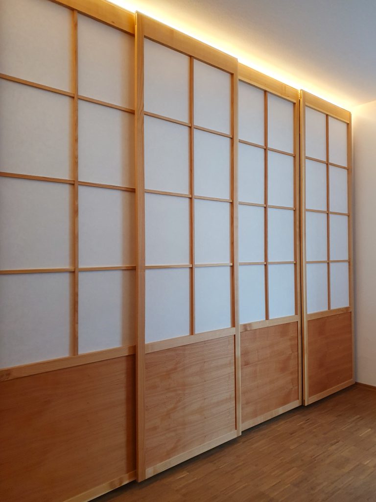 Eine weitere Variante, die Fronten auszuführen, sind sogenannte Shoji-Türen. Dabei werden filigrane Holzrahmen mit reißfestem Papier bespannt. Lesen Sie dazu gerne den Beitrag Shoji-Türen im Portfolio.